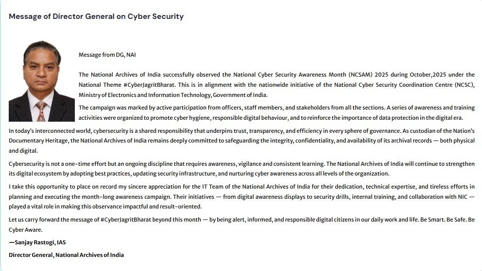 The Director General of Archives, heading the Department has been given the mandate for the implementation of the Public Records Act, 1993 and the rules made there under the Public Records Rules, 1997 for the management, administration and preservation of public records in the Ministries, Departments, Public Sector undertakings etc. of the Central Government. Located at the heart of New Delhi, the Department functions as an Attached Office of the Ministry of Culture and has one Regional Office at Bhopal and three Records Centres at Bhubaneswar, Jaipur and Puducherry. The Department celebrated its 125th year of the foundation during 2015-16. Read More>>